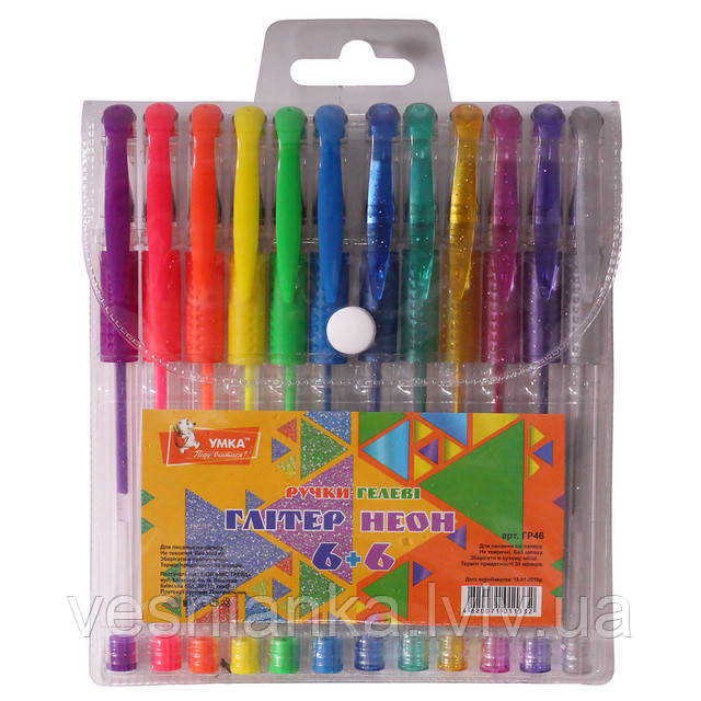 Набір ручок гелевих 12 шт. Комплект 6 з блиском + 6 неонових ГР46 Умка